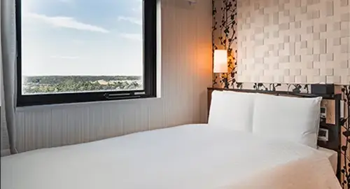 ダブルサイズのベッドでゆったりとお寛ぎ頂けます。ベッドはシモンズ製のベッドを採用しており、心地よい睡眠をご提供いたします。